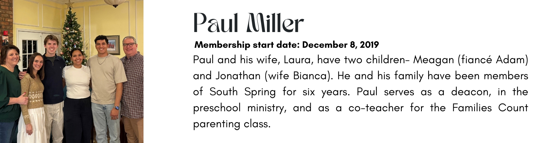 Lance and his wife Kristin have three daughters- Alana, Elora, and Catalyn. He and his family have been members of South Spring for three years. Lance leads the New Beginnings class with his wife, in addition to leading a small discipleship group and discipling people one-on-one.