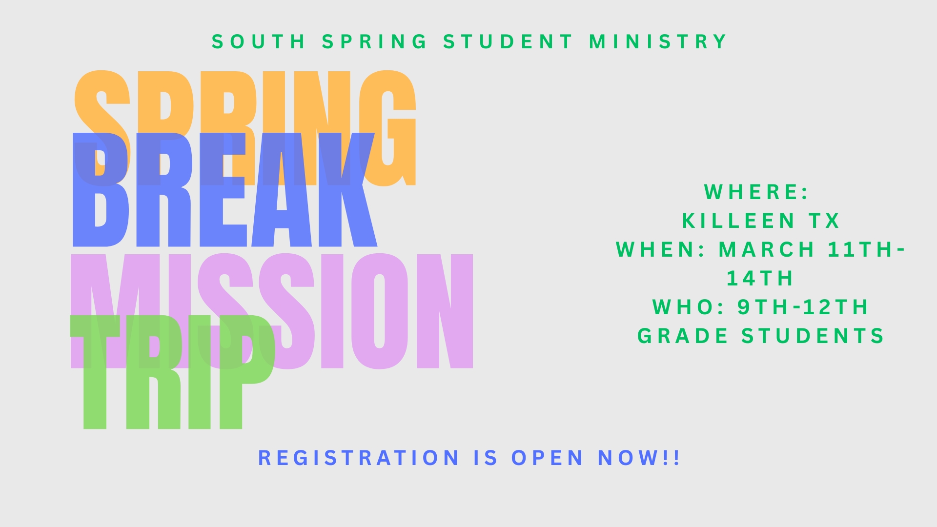Student Ministry is the 6th-12th Grade Ministry at South Spring Baptist Church. Check out our list of upcoming events below.
