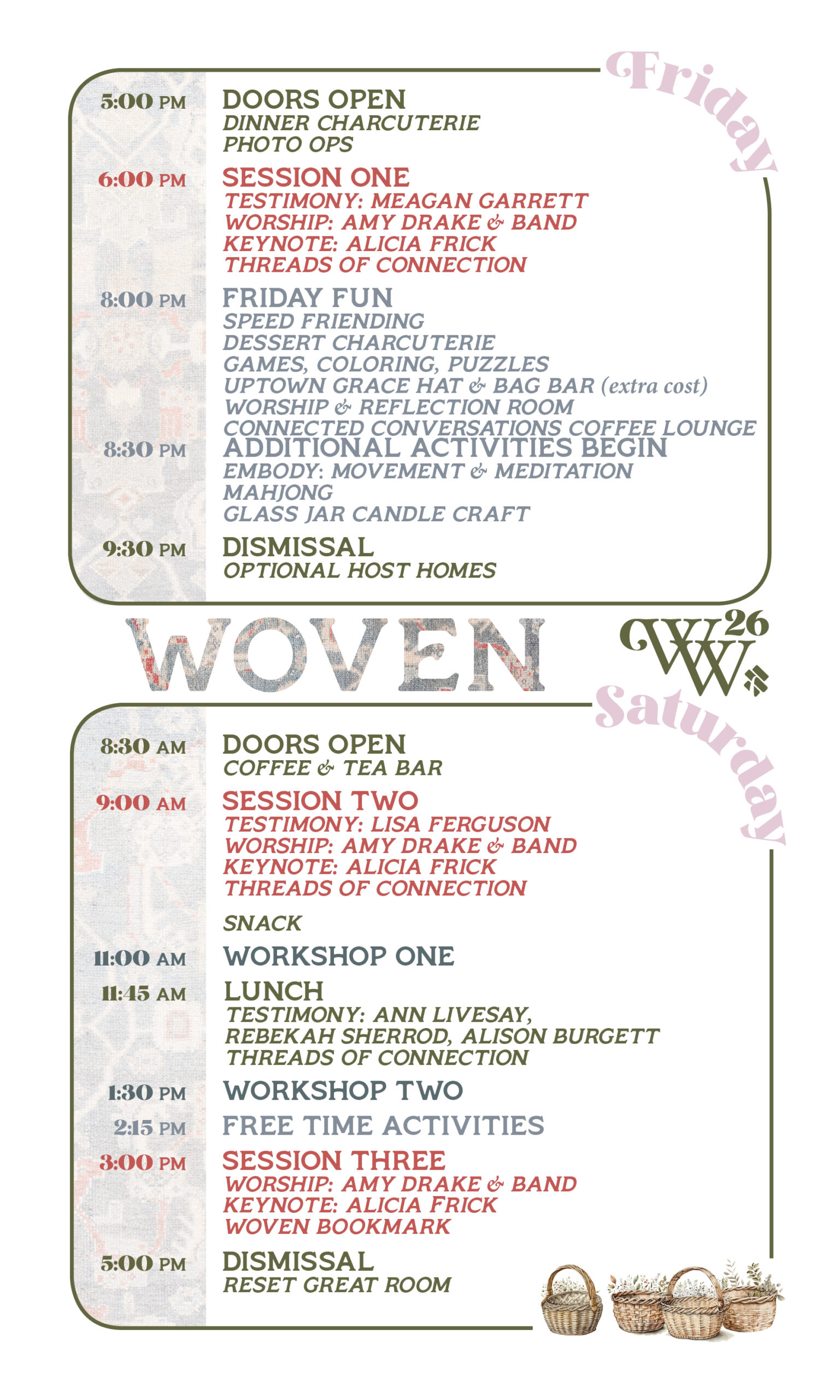 You may choose to bring a Bible, pen, notebook and water bottle. We will have drinks and snacks available at all times. More info to come on workshops, but know you can dress comfortably!